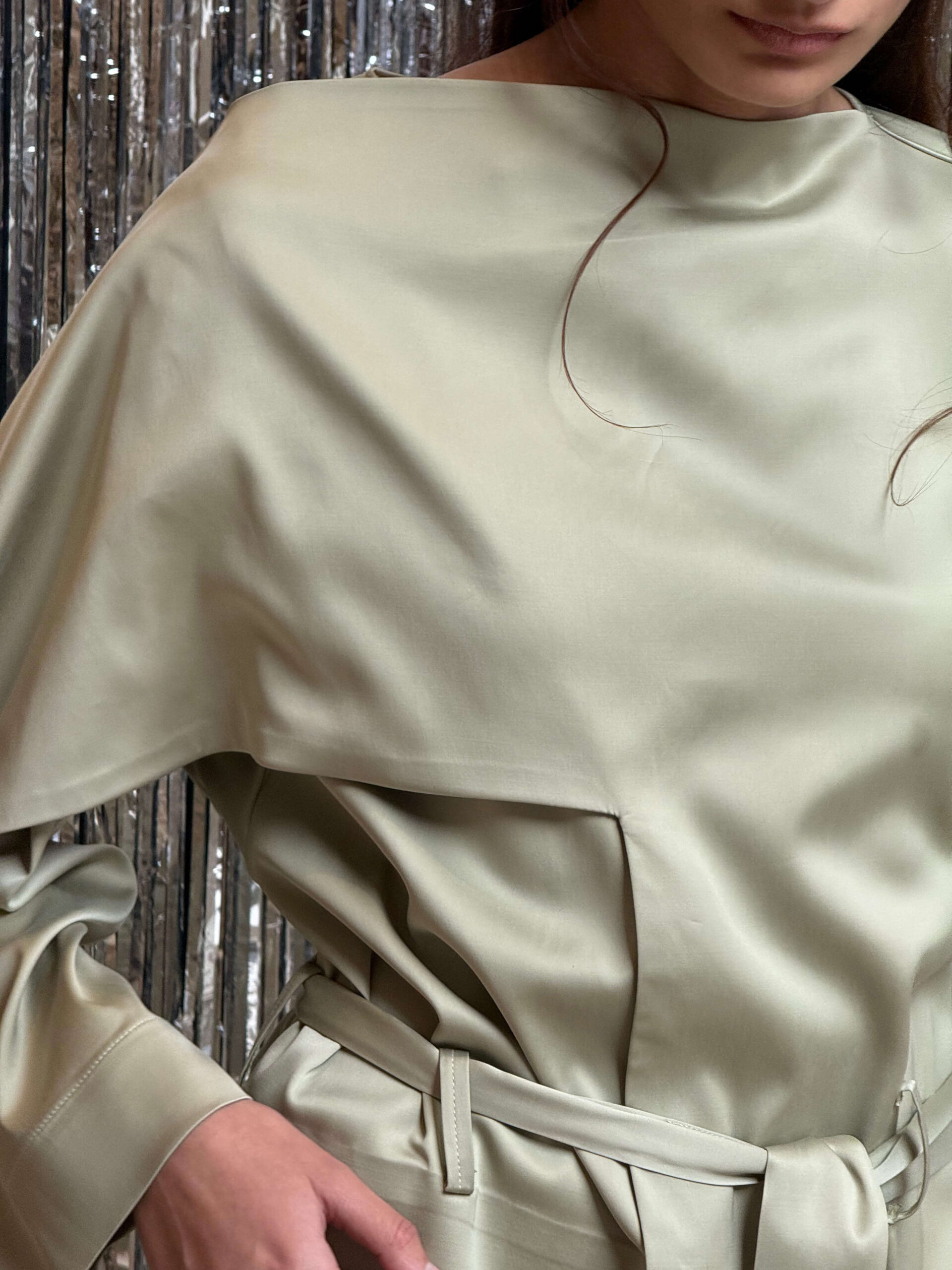 Платье из плотного купро с натуральным атласным переплетением. С элементом шарфа, прикреплённым к одному плечу. Застёгивается на пуговицы спереди. С поясом на талии։