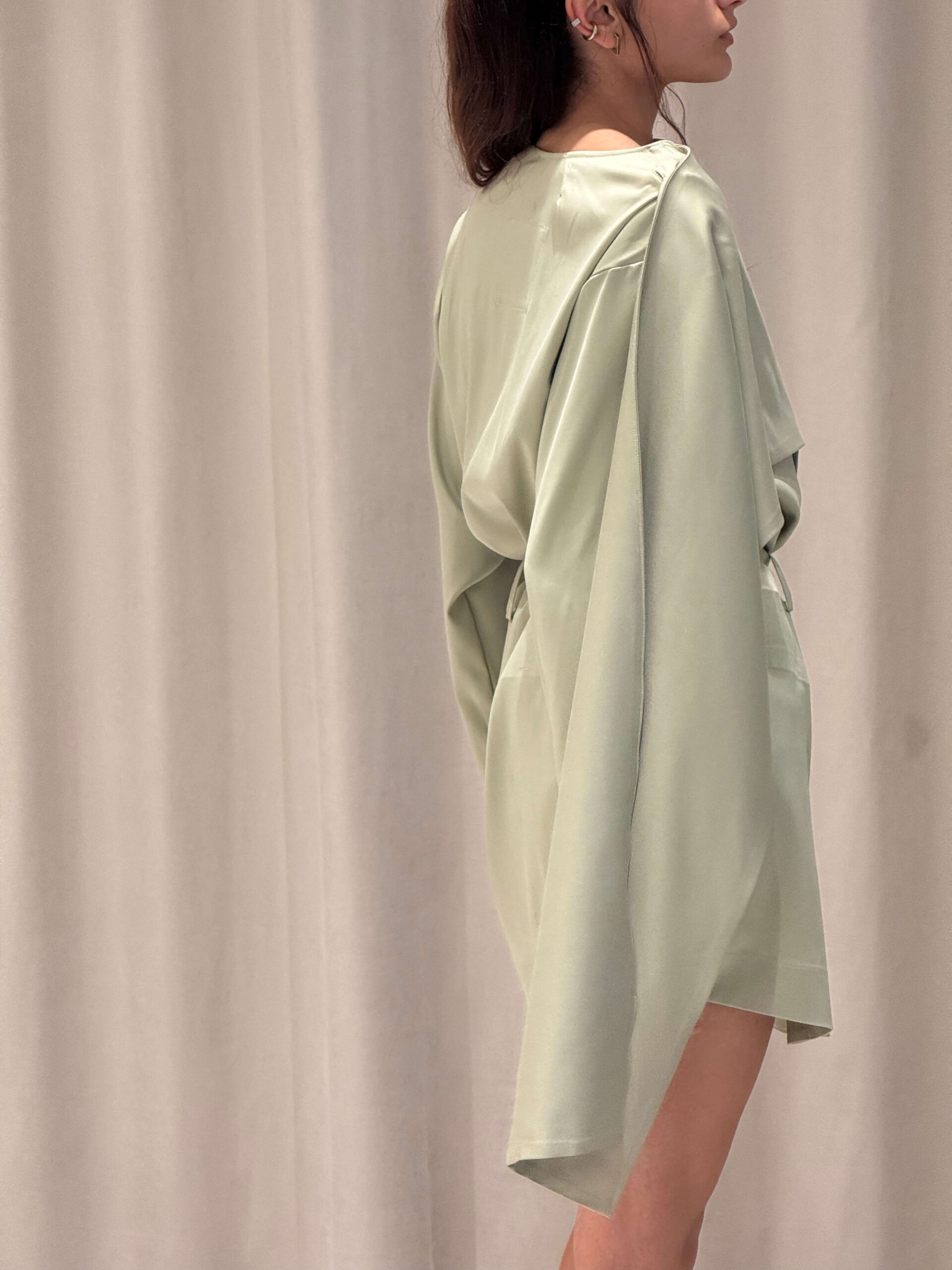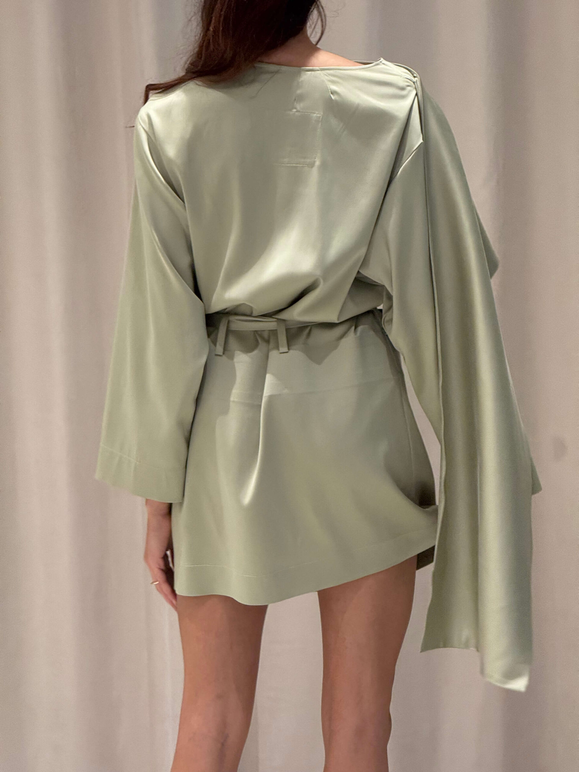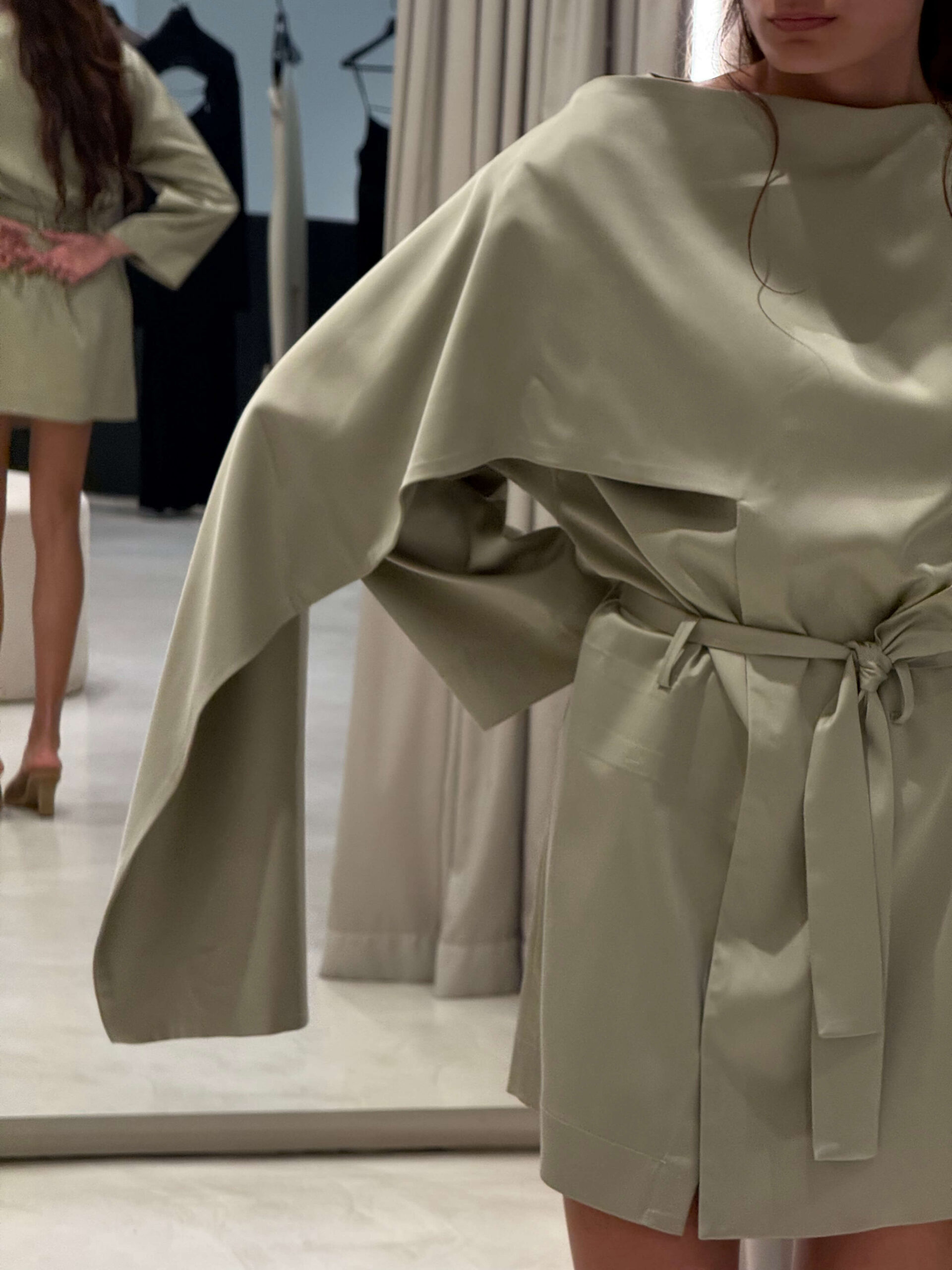 Мини-платье из чистой шелковой органзы. С элементом шарфа, прикреплённым к одному плечу. Застёгивается на пуговицы спереди. С шелковым поясом на талии.